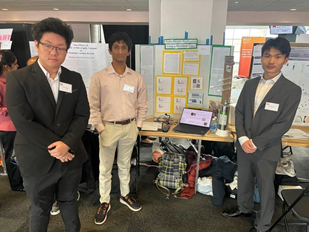 What began as a simple assignment for our school science fair as part of the Intro to Science Research elective has since grown into an award-winning research project. We three high school students from Acton Boxborough Regional High School were ultimately selected to compete at the 2024 Massachusetts Science and Engineering Fair (MSEF) at Gillette Stadium on April 5, 2024, where our project, entitled “Septic biogas purification with a microbial filter,” won first place in the category of environmental engineering among hundreds of top projects.